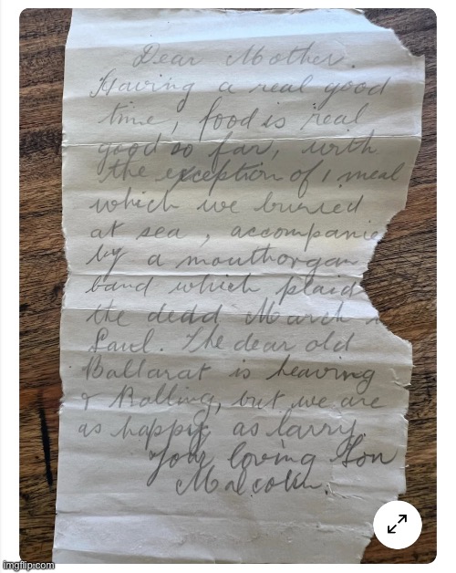 109 year old message in a bottle found in Australia. WWI Aussie Soldiers on a troop ship to France.
