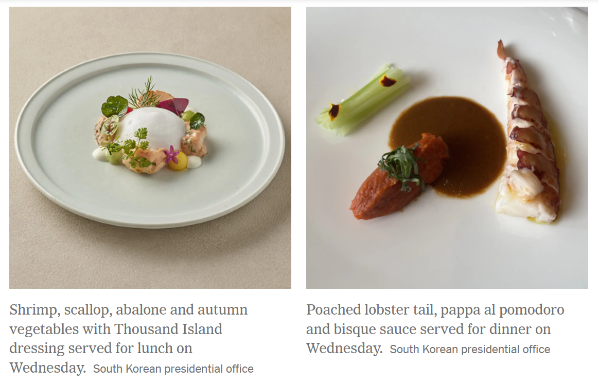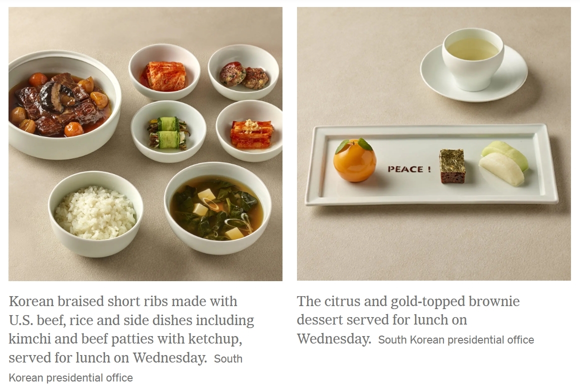 "The lunch he shared with President Lee Jae Myung of South Korea and business leaders on Wednesday was summed up by Mr. Lees office as 'fusion Korean cuisine featuring regional specialties from across the nation and tailored to President Trumps preferences,'" the Times reported.