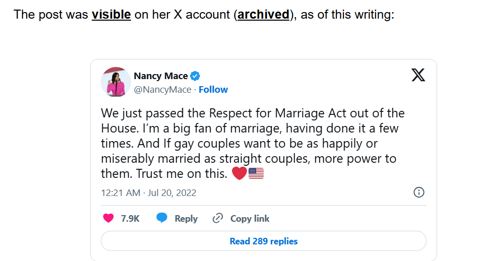 2022 Nancy Mace post supporting same-sex marriage spreads online