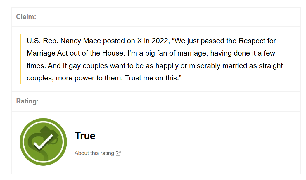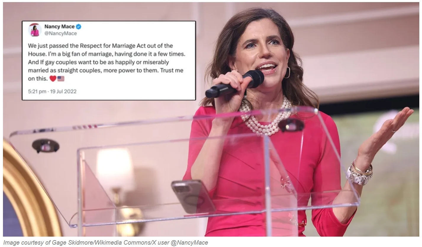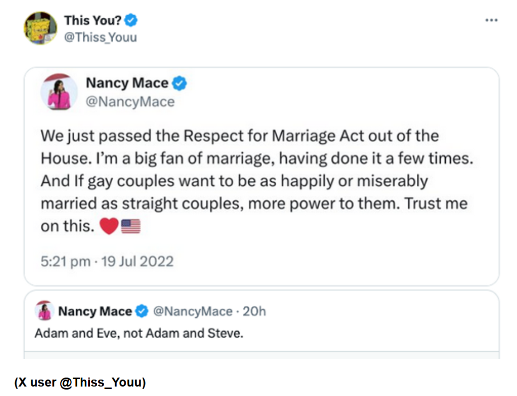 X post by Republican Rep. Nancy Mace of South Carolina spread across the internet, supposedly showing her past support for same-sex marriage. The alleged post from 2022 read: "We just passed the Respect for Marriage Act out of the House. I'm a big fan of marriage, having done it a few times. And If gay couples want to be as happily or miserably married as straight couples, more power to them. Trust me on this."