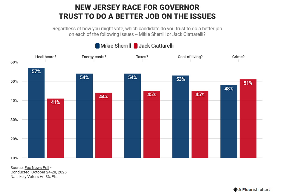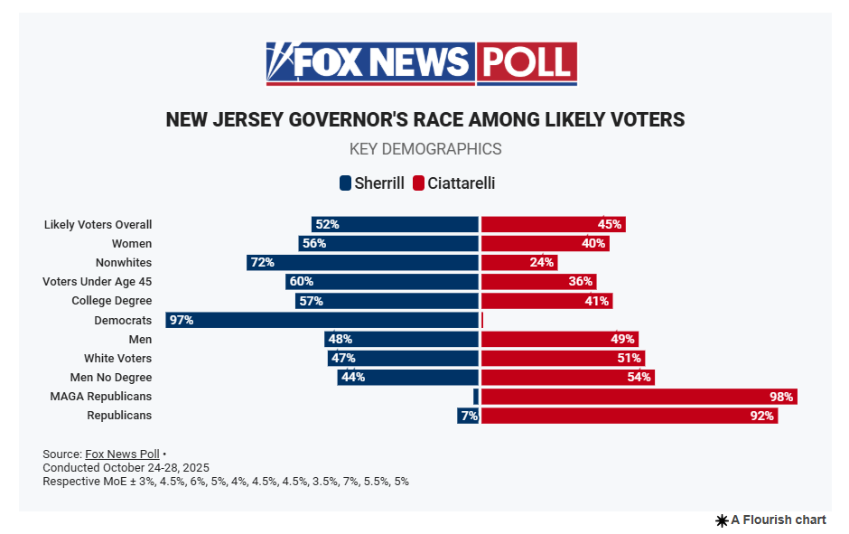 Sherrill is preferred by 48 points among non-whites, 24 points among voters younger than 45, and 16 points among those with a college degree. Some 97% of Democrats support Sherrill, while Ciattarelli gets 92% among GOPers. Seven percent of Republicans say they are backing Sherrill compared to only 1% of Democrats voicing support for Ciattarelli. (There are too few independents to break out.)