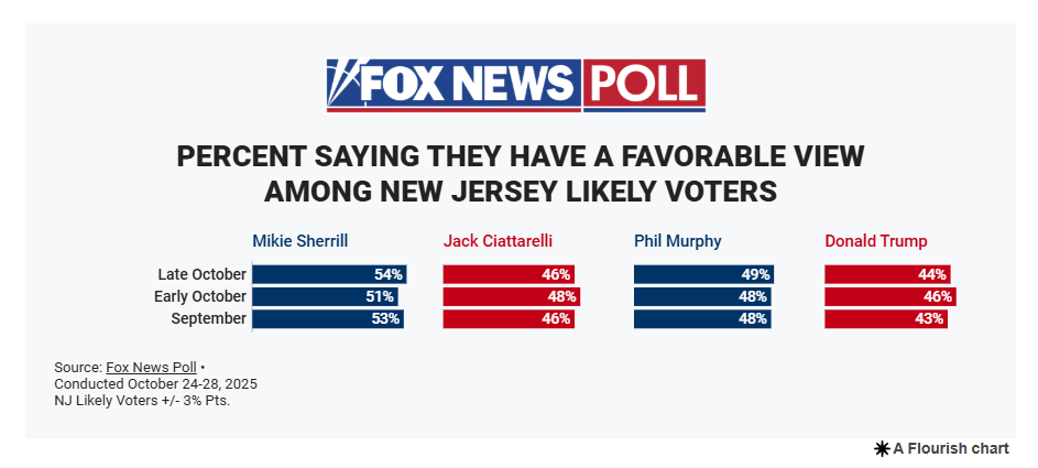 A new Fox News poll finds Mikie Sherrill leading Jack Ciattarelli by 52% to 45% heading into the last few days of the New Jersey governors race.