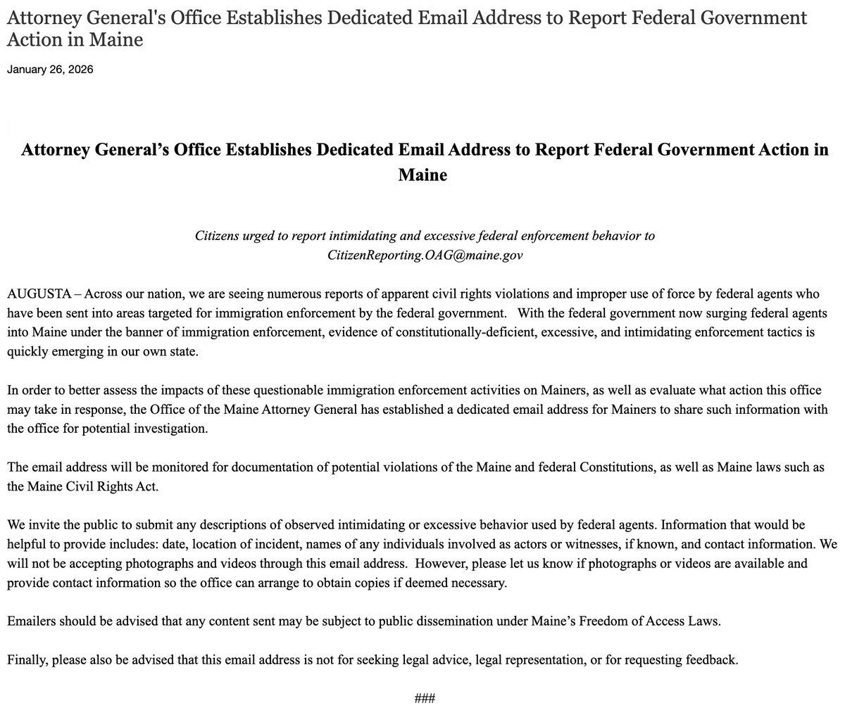 https://www.mainepublic.org/immigration/2026-01-26/maine-attorney-general-creates-email-tip-line-for-alleged-ice-abuses