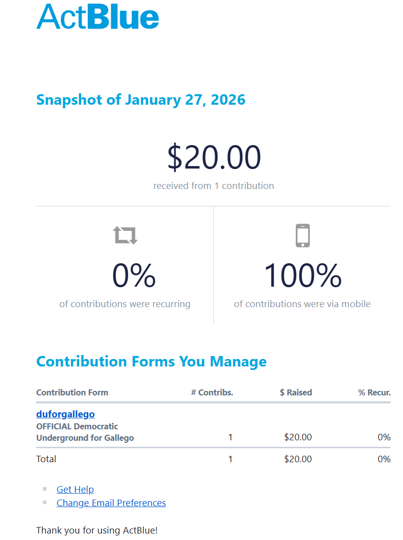 You raised $20.00 on January 27, 2026 @ ActBlue