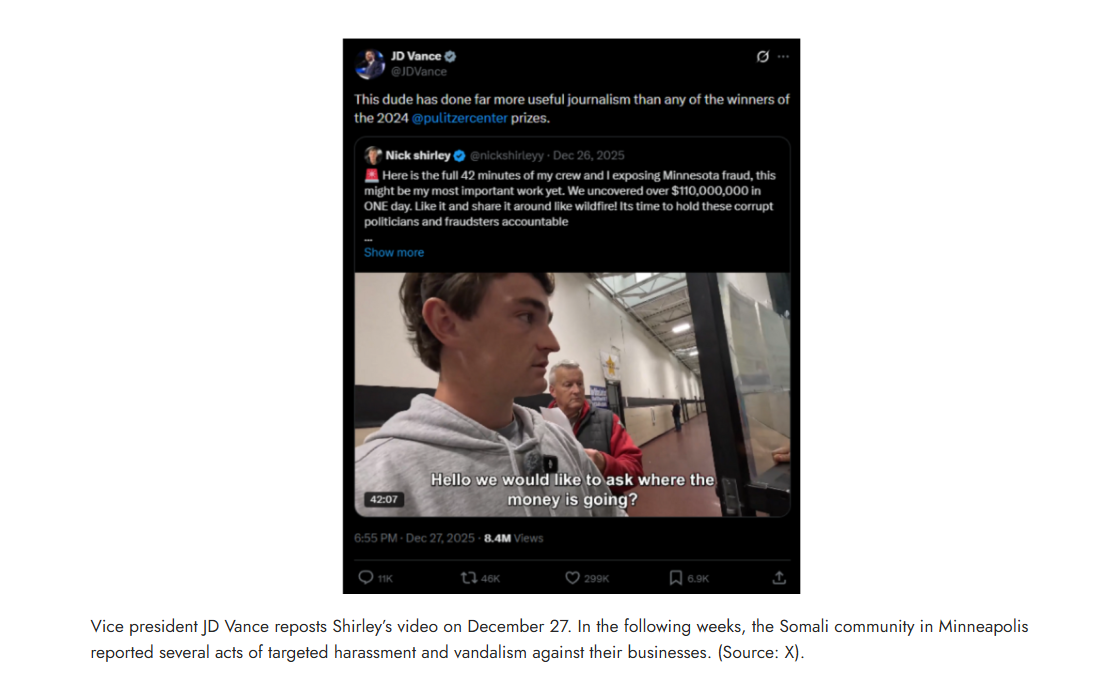 Throughout January, Somalis across Minneapolis reported facing harassment, threats, and vandalized businesses after 23-year-old content creator Nick Shirley posted a viral video on X, YouTube, and Rumble in late December baselessly accusing the community of running fraudulent child care centers. It was reposted by Vice President JD Vance and Elon Musk.