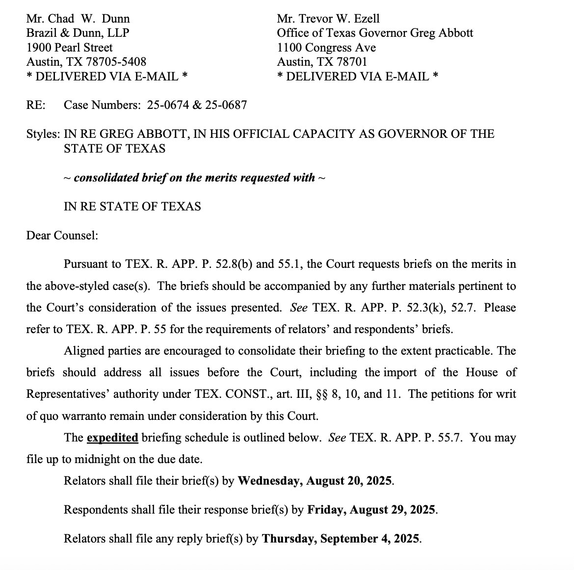On Monday, the court rebuked that proposed timeline, setting a three-week period of briefings from both sides. The schedule, which the court noted is expedited, anticipates final responses to be filed on Sept. 4, more than two weeks after the current special session is set to end....